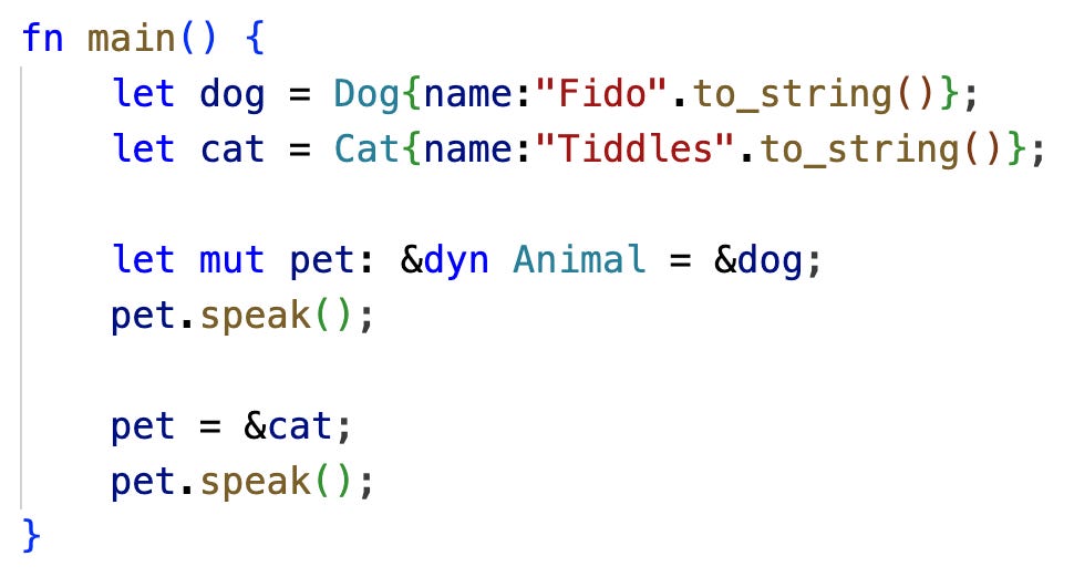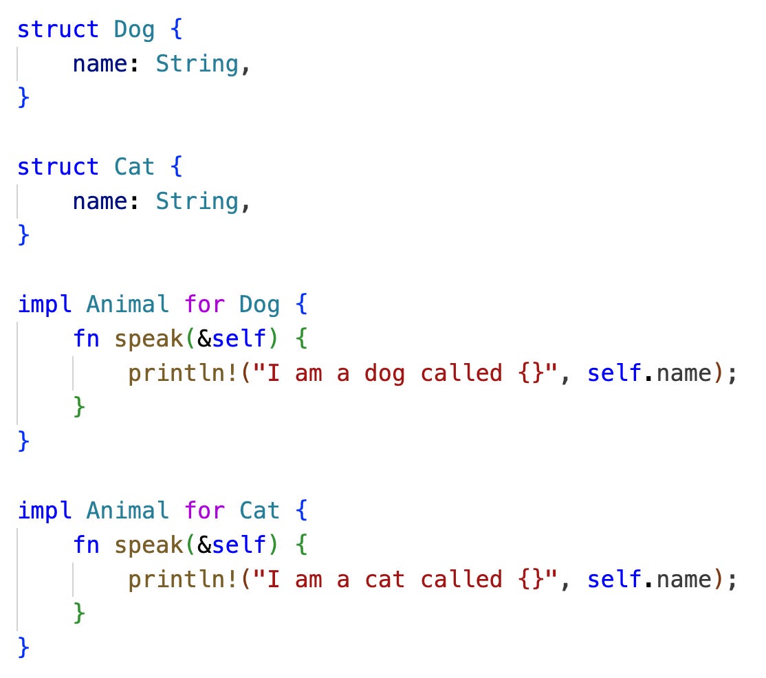 Dog and Cat are then just structs which implement this trait.