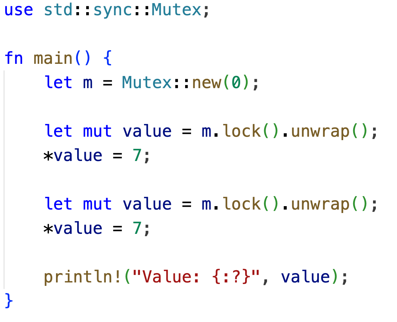 The examples in this page are all built around the Rust documentation at https://doc.rust-lang.org/book/ch16-03-shared-state.html